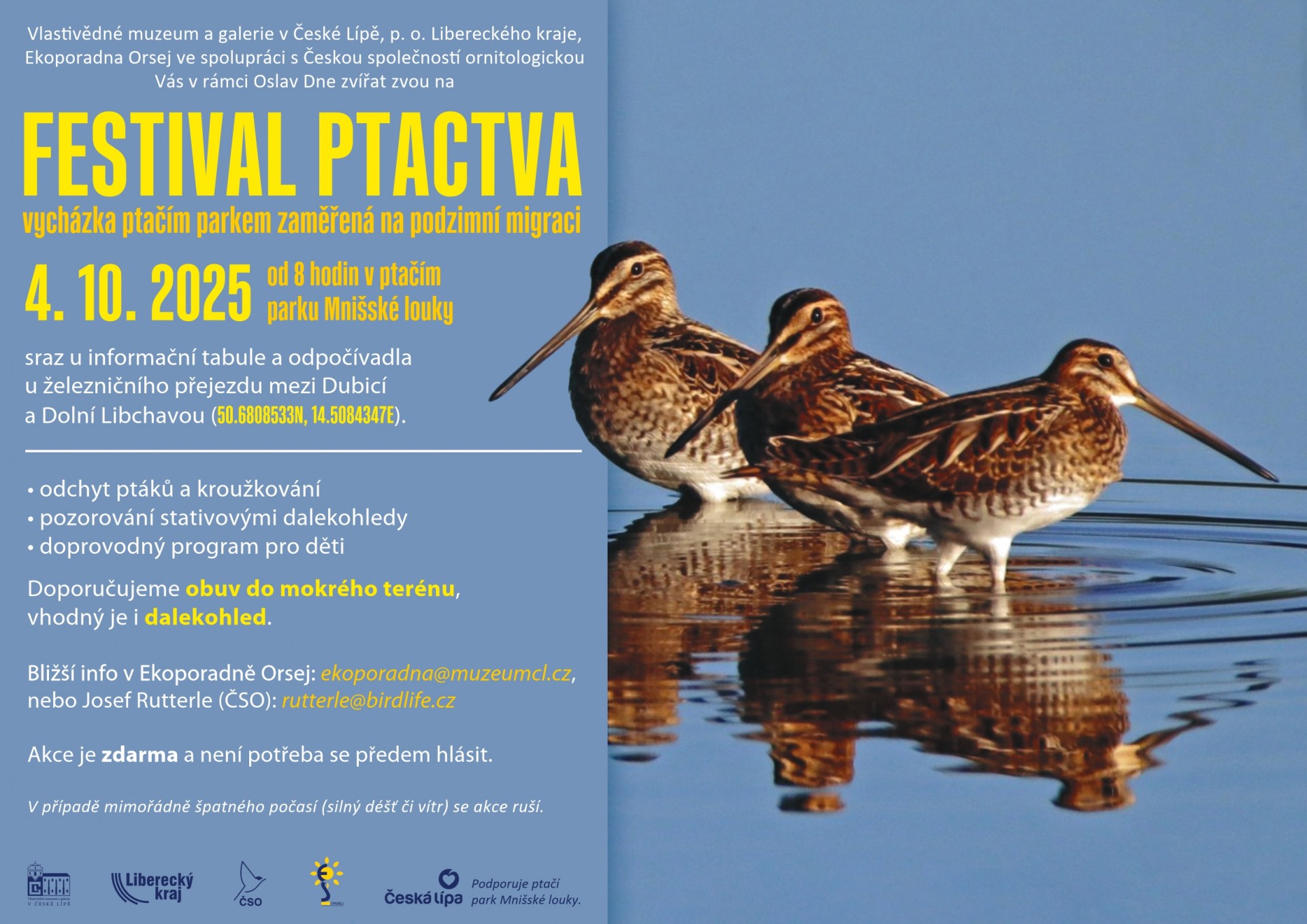 Vlastivědné muzeum a galerie v České Lípě, p. o. Libereckého kraje (VMG) a Ekoporadna Orsej si ve spolupráci s Českou společností ornitologickou (ČSO) dovolují pozvat všechny milovníky přírody a ptactva na letošní Festival, který se koná v rámci muzejních Oslav Dne zvířat v sobotu 4. 10. 2025 od 8 hodin v ptačím parku Mnišské louky.